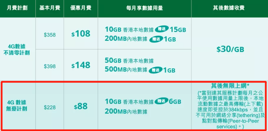 最便宜的是“无忧计划”,88港币有10GB流量,活动再送6GB,外加200MB内地流量,可签约1年或2年。但以现金缴费需要预缴2个月,如果需要打电话回内地则需要额外300元押金。