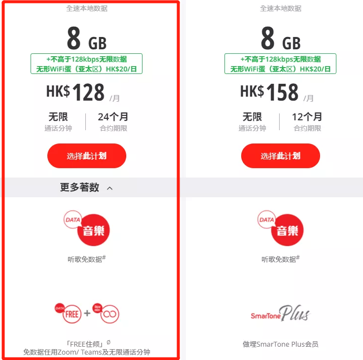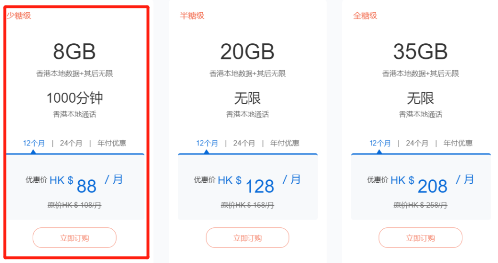 88港币的套餐,本地通话限1000分钟,可签约1年或2年,流量8GB,月付每月88港币,也可以选择年付。