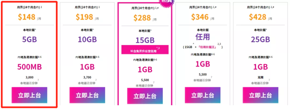 因为现在香港并没有普及5G,所以下面迪迪为大家对比的都是各大运营商4G或4.5G最便宜的套餐。
