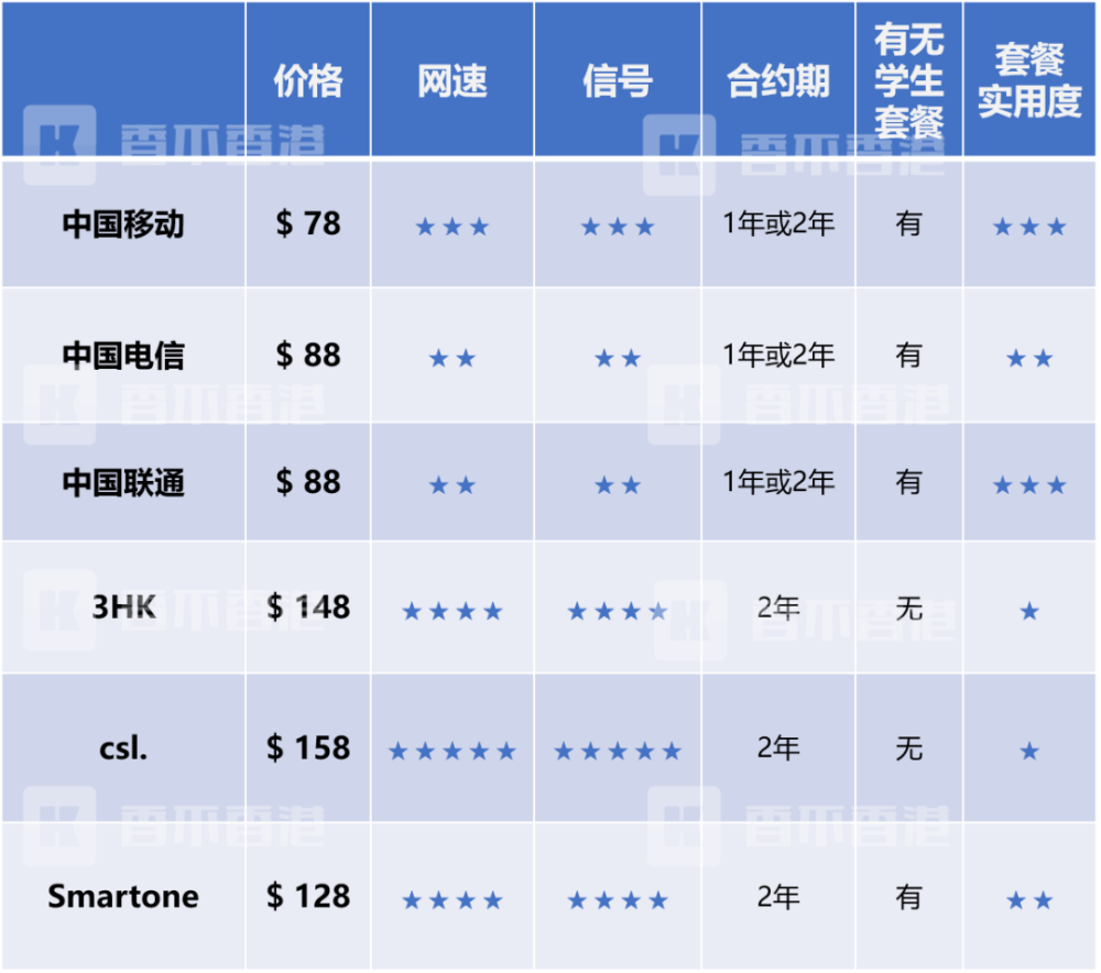 3HK、csl、Smartone为香港最主流的运营商,信号网速有保障,但是3HK、csl没有学生套餐,性价比太低,不建议大家选择;Smartone有学生套餐,但是需要签2年的合约,后期想换套餐或者离开香港不够灵活,留学生慎选。