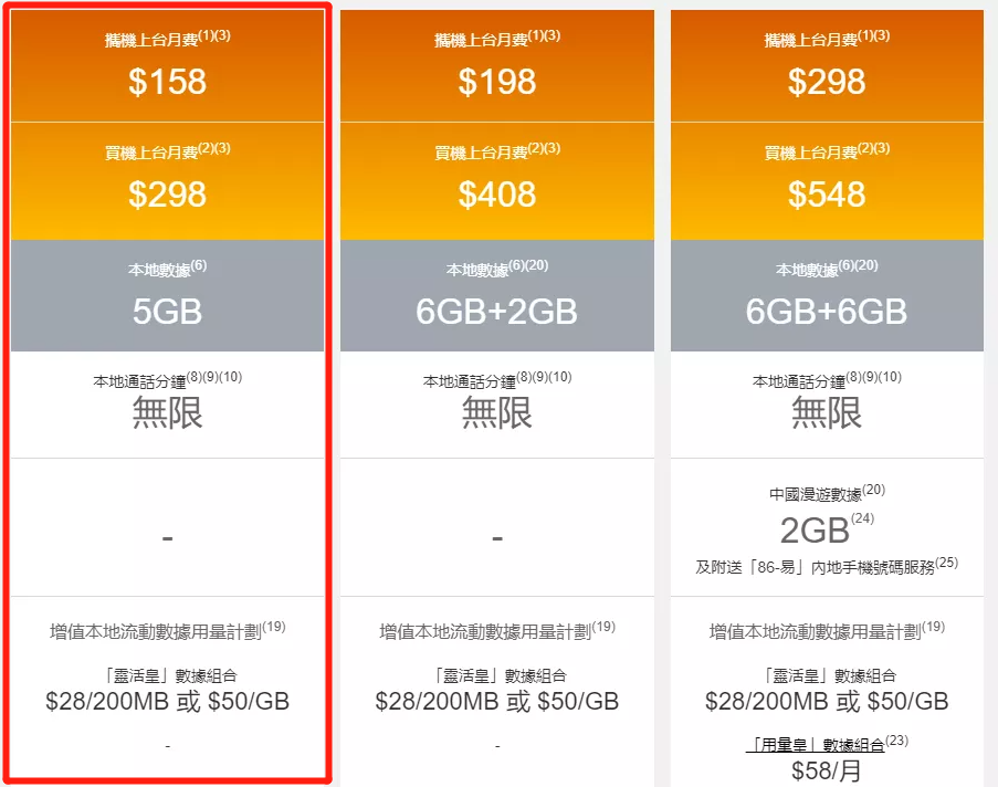csl.同样没有学生计划,这个月费就更加不友好了,最便宜的套餐每月158港币,合约期固定为2年,本地无限通话,流量只有5GB,若是超过套餐流量,就需要额外支付50港币/GB。