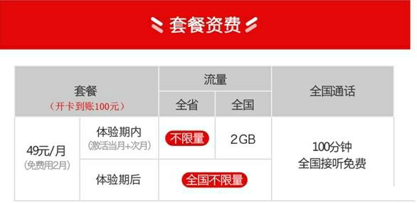 这款套餐也是由电信所推出来,其套餐内分为体验期内和体验期后这两种不同的使用模式,而且在流量方面内,体验期内全省范围内是不限量套餐资费的,而在全国范围内则是每个月2GB的全国流量套餐,而在体验期后则是全国流量不限量使用,在全国通话方面则是每个月有100分钟的全国接听免费。