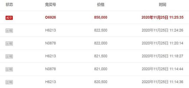 拍卖时间从2020年11月24日10:00开始,至原定结束时间2020年11月25日10:00前,最后5分钟仍旧有竞买人出价,并经过了129次延时。最终,手机靓号1**8*888888以85万成交。