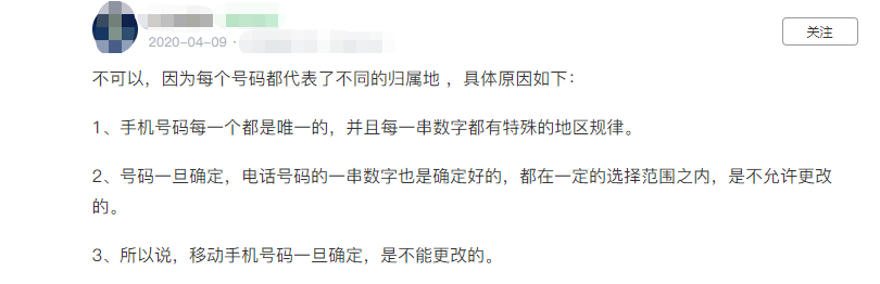 而笔者认为因为管理的原因,手机号码资源跟身份证号码一样,11位号码是有其代表意义的,前三位代表运营商,中间四位表示地区,后四位是客户编号,如果可以更改归属地,那么对于宏观的号码管理来说,就会有很大的影响,例如无法准确估算当地号码资源的使用情况,也就无法准确的开放新的号源了。
