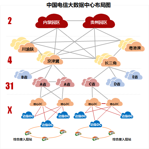 由于各地的区位价值、土地成本及能源、冷源自然资源各不相同,为最大限度发挥比较优势,中国电信采用“围绕核心,区域协调,云边分布、点线结合”的方式,打造“2+4+31+X+O”的大数据中心布局:既有位于内蒙古、贵州的10万+机架、100万+服务器规模的“超级航母”,也有离用户最近不超过1公里的综合接入局所,可满足用户从海量算力到超低时延等各种需求。