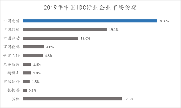 经过多年发展,目前国内IDC领域形成了“以运营商为主、第三方厂商为辅”的市场格局。根据中国信通院报告,2019年中国三大电信运营商市场份额占比超过60%。其中中国电信IDC市场份额占比行业第一;第三方IDC服务商市场份额总体较小且较为分散。