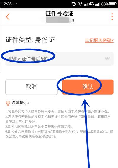 7、查询详单需要进行身份认证,在“证件号验证”页面,输入自己身份证号码的后六位后,单击“确认”;