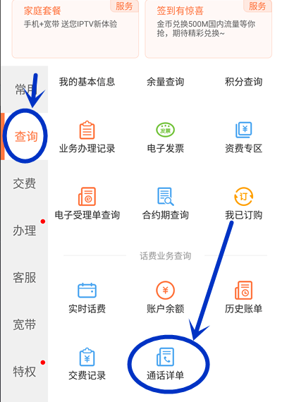 6、在“服务”页面,先单击左边的“查询”选项卡,上划页面,找到“通话详单”单击;