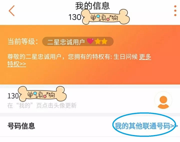 点开后,在登陆号码的右边可以看到“我的其他联通号码查询”,点击即可看到名下的所有联通号码。