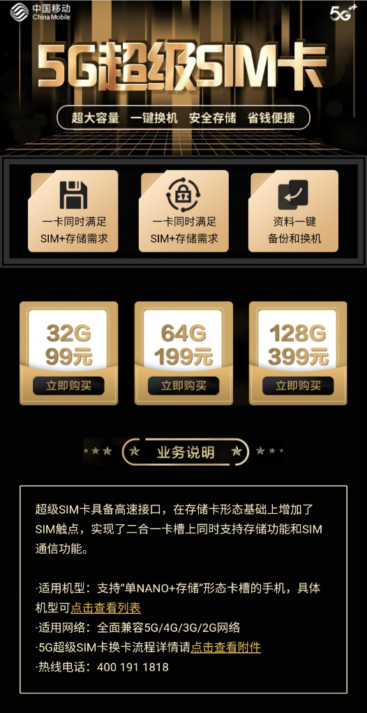 5G超级SIM卡全面兼容5G/4G等网络,兼具通信与存储功能,有32G/64G/128G三种超大容量版本,支持一键换机、安全存储,省钱又便捷,是当下颇受消费者欢迎的一大热门产品。此次北京移动对5G超级SIM卡的开售,覆盖了线上、线下各大渠道,全面售卖三个容量级别,除了零售办理外,还推出了三大优惠政策。