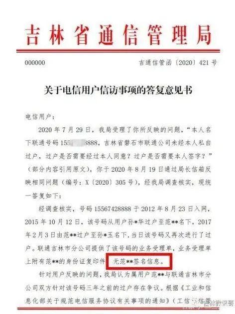 吉林省通信管理局表示,联通吉林市分公司提供了该号码的业务受理单,业务受理单上附有范××的身份证复印件,无范××签名信息,属于不合规操作。建议用户与吉林联通协商处理,如果协商不好,可以向当地人民法院主张个人意愿。