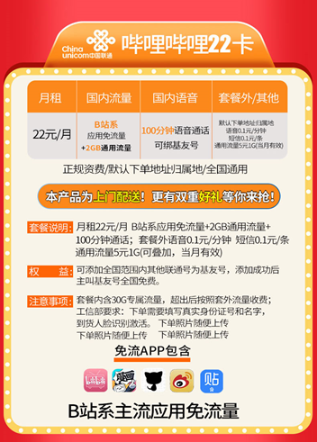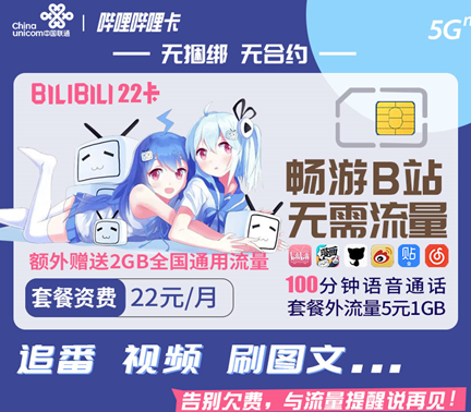 哔哩哔哩22卡是联通与B站联合推出的优惠套餐,支持哔哩系、新浪微博、百度贴吧、猫耳FM、网易云音乐、Bilibili旗下轻视频等APP全国30GB免费流量,B站免流+低月租+日租宝套餐简直不要太划算. 告别欠费,与流量提醒说再见!