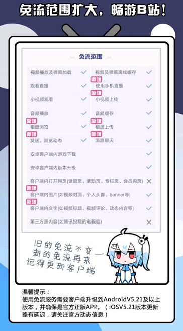 近期,哔哩哔哩22、33卡更扩大了免流范围,原本就可以免流观看大部分视频和弹幕,在升级之后,免流范围新增手机直播、小视频上传、相册浏览、相册上传、发送/浏览动态、消息聊天、客户端内图片等。在免流范围升级后,App内需要消耗套餐内流量的只有第三方视频源(观看前会提醒你其为非免流视频)以及特定网页,所有在大家的流量还没有到达40G上限前,都可以安心地泡在B站里了。