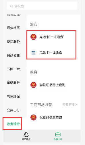 5、选择政务综合中的“治安”选项中“电话卡一证通查”;