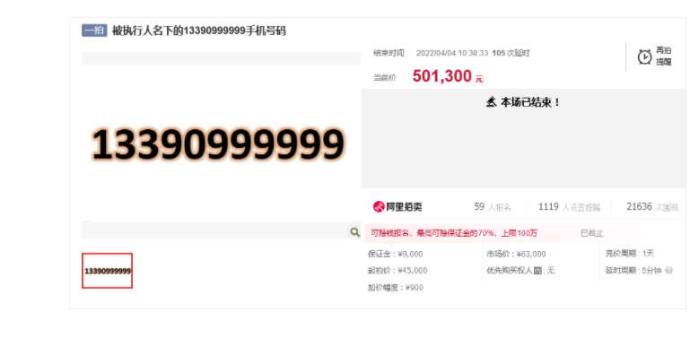 手机号码是公民的虚拟财产,一些“靓号”手机号码拥有较高附加值,如何变现受到很多人关注。4月3日至4月4日,南通市通州区人民法院(下称通州法院)在阿里司法拍卖平台,对一名被执行人名下的电话号码13390999999的使用权进行拍卖,经过163次竞价,最终被竞买人以50.13万元拿下,较起拍价4.5万元高出45万余元,溢价逾10倍。