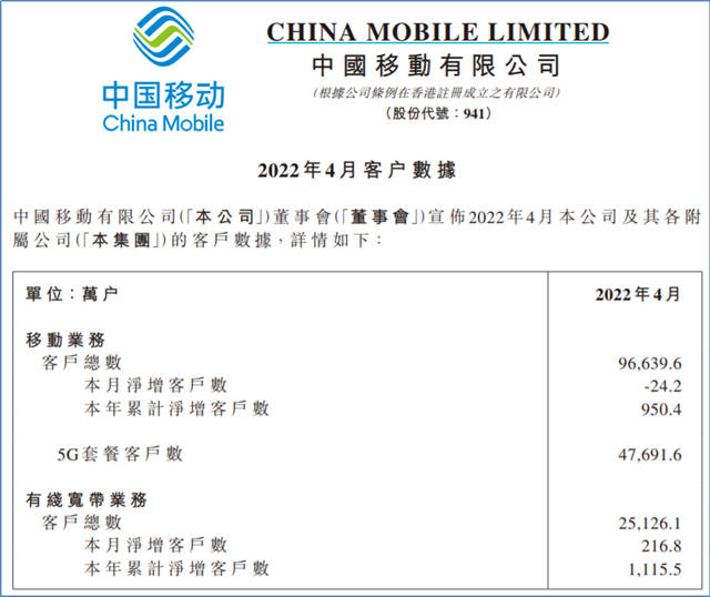 4月份,中国移动移动客户数净减24.2万户,用户总数达到9.66396亿户。当月,中国移动 5G 套餐客户数净增1036.5万户,累计达到4.76916亿户。有线宽带客户数净增216.8万户,累计达到2.51261亿户。