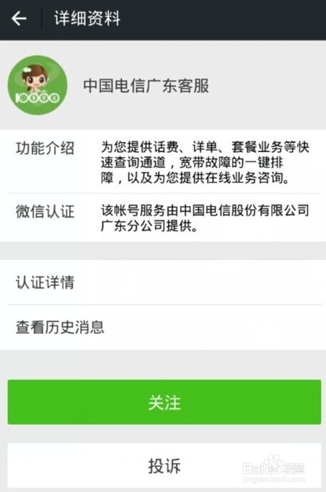 关注成功后,进入中国电信广东客服并使用你的电信号码绑到微信中去。这一步由于我已经绑定过所以演示不了。
