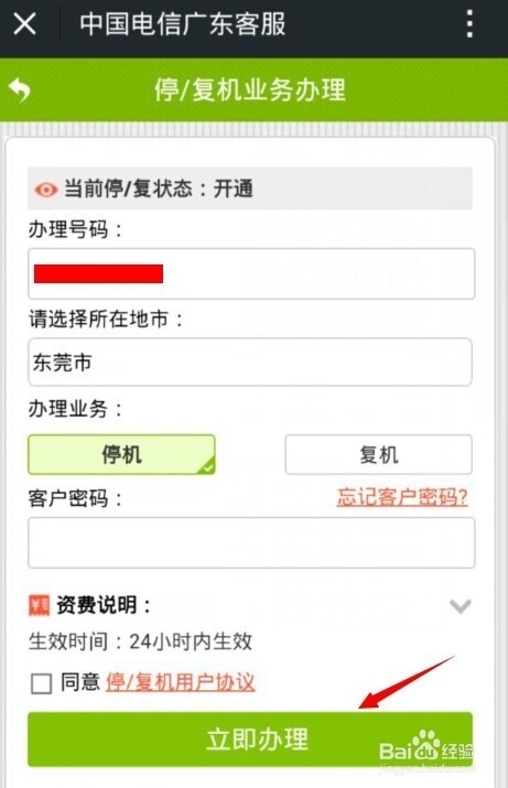 在这个界面下号码和所在地区在绑定的时候就会识别出来,选择办理业务。是你要停机还是复机。再输入你的客户密码。同意停/复机用户协议最后点击【立即办理】就可以完成了。复机也是在这个一地方只是选择的业务不一样。
