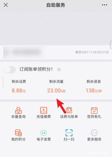 2、输入手机号码完成绑定,登录成功后在自助服务页面,查看【剩余流量、剩余话费、剩余语音】等信息。