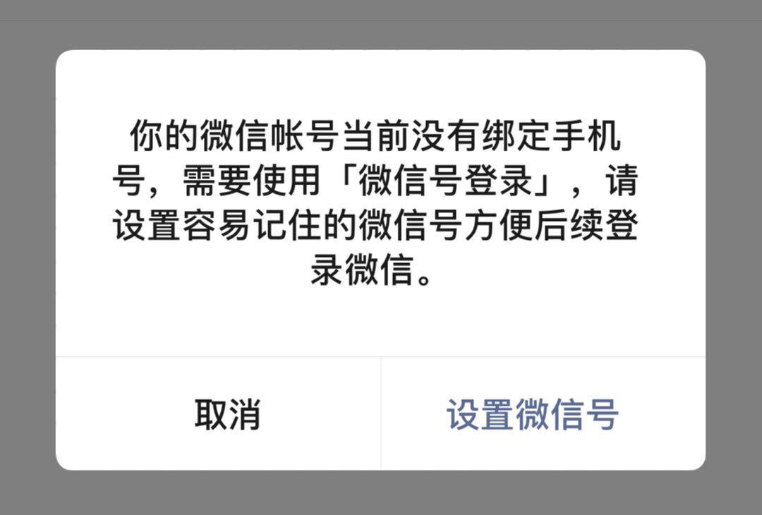 你的微信账号当前没有绑定手机号,需要使用微信号登录,请设置容易记住的微信号,方便后续登录微信。