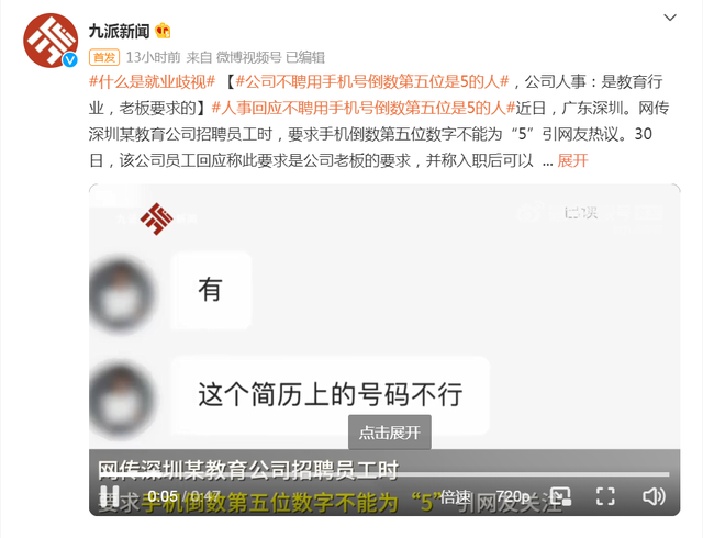 又现就业歧视?据九派新闻8月31日报道,近日,网传深圳某教育公司招聘员工时,要求手机倒数第五位数字不能为“5”引网友热议,该新闻还登上了百度热搜。