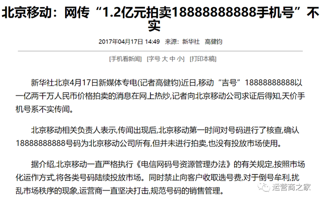 2017年,网上流传,中国移动第1号18888888888以1.2亿元的价格拍卖,对此,北京移动发布辟谣称并无此事。
