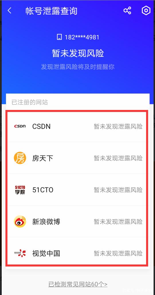 再点击“帐号泄露检测”,然后输入我们的手机号,输入我们收到的验证码,然后就可以查看到我们的手机号绑定的网站信息了,可以说也是一目了然。