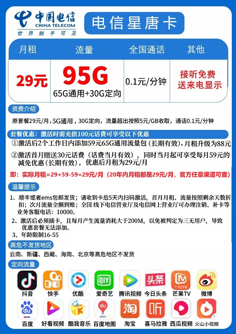 第三,就是一劳永逸的方法,办理一个低月租大流量的套餐,比如下方的电信星唐卡电信29元星唐卡,每月包含:65G全国流量+30G定向流量+众多定向免流软件,本套餐为20年长期套餐,套餐内容长期不变,无返费无任何套路,强烈推荐申请的神卡。