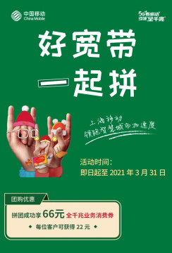 所以如果时常感觉宽带不够用,就是时候将宽带升速提上日程啦。大家近期可以参加上海移动推出的“好宽带一起拼”活动,享受宽带优惠。只要在3月31日前新装办理宽带产品并发起拼团,3人成团且均完成新装下单,全团每位用户就都可以获得全千兆业务消费券22元,用来抵扣账单费用,相当划算哦!当然也可以通过办理上海移动套餐的方式获得高速宽带服务,花一份钱同时解决手机通讯和家庭上网两大需求;对于经常出差的小伙伴来说,甚至可以宽带日租,更加灵活方便,不用不花钱,低至1元1天!