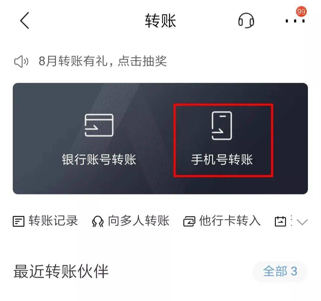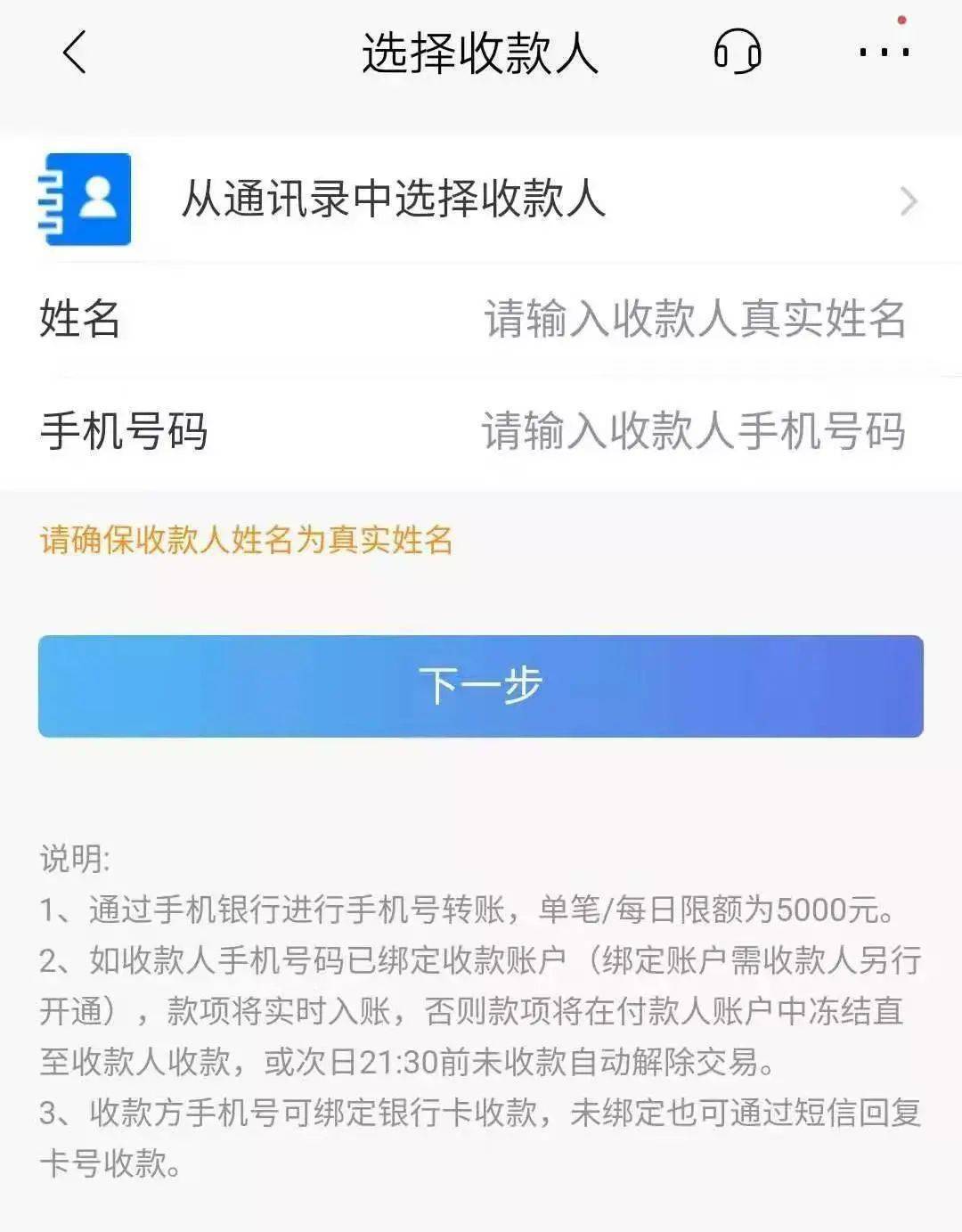 以某手机银行APP为例,在该手机银行APP中,找到手机号转账功能;