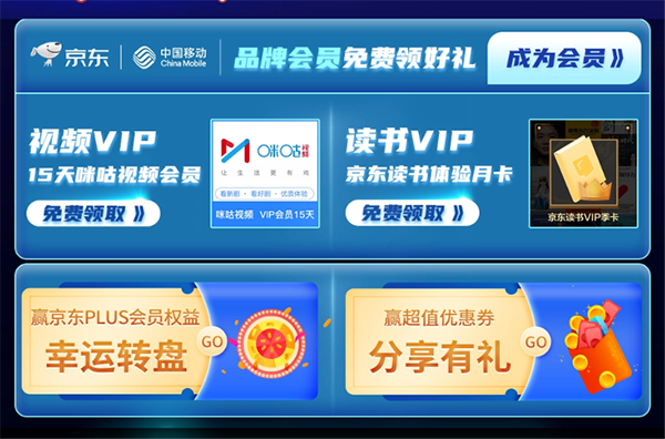 与此同时,京东与中国移动联手推出了众多线上优惠,如成为中国移动官方旗舰店粉丝,就可以抽取京东PLUS会员惠购卡,分享后获得超值优惠券,成为会员免费领取咪咕视频VIP 1体验15天权益等;还能在旗舰店内办理超值号卡套餐,享受首月免月租、128元档套餐限时八折等优惠;以及来自咪咕视频的专属福利,包括68元每年的钻石年包会员、118元的阅读至尊年包会员等。