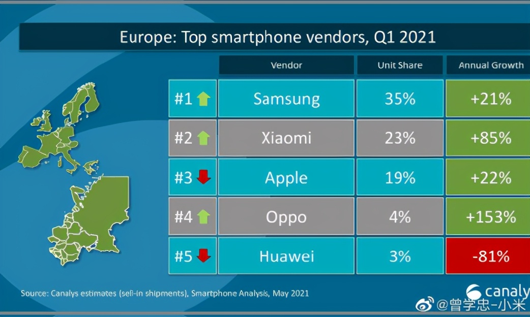 根据海外调研机构canalys2021年第一季度的欧洲智能手机销量排名,小米已经超越苹果挤进前二,仅次于三星。也是继华为之后第二家在欧洲夺下第二名宝座的中国企业。