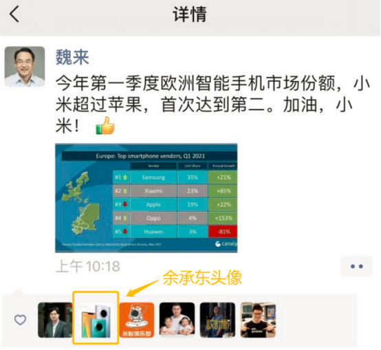 有意思的是,余承东似乎也是这样想的,因此还点赞了小米高管魏来的朋友圈。