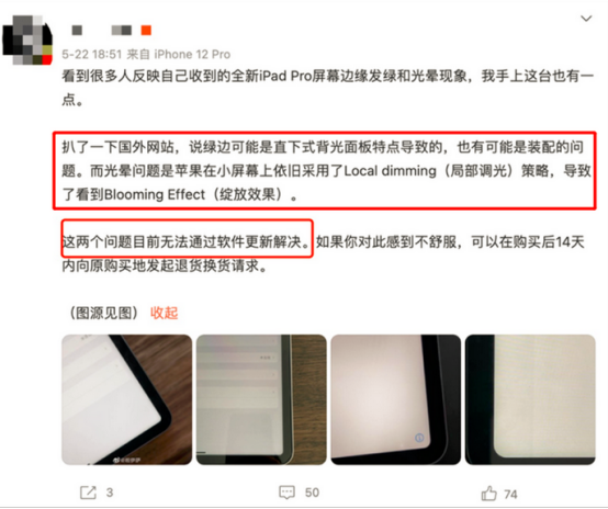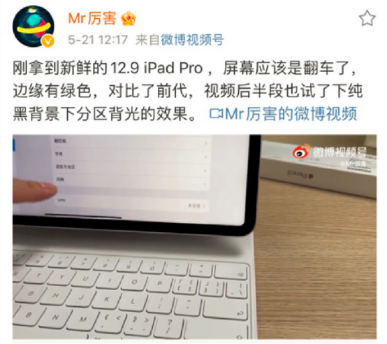 据多名博主反应,iPad Pro存在屏幕边缘发绿光、偏暗的问题。