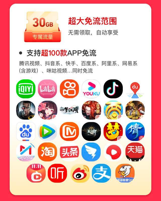 热门免流APP有:爱奇艺、哔哩哔哩、快手、优酷、抖音、百度地图、阴阳师、一梦江湖、和平精英、百度、腾讯视频、芒果TV、梦幻西游、倩女幽魂、淘宝、今日头条、钉钉、天猫、斗鱼、微博、咪咕视频等等超过100款的app。