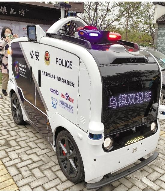 在桐乡市公安局乌镇分局门外,有两个一米多高,长着黑眼睛、白肚子的无人车,在路上巡逻。一辆无人车刚从互联网之光博览会巡逻回来,车顶上的喇叭还播放着防诈骗宣传语。这两辆本月刚上岗的5G无人安防车,使用的是浙江移动的5G网络,可以实现单次100公里巡航。