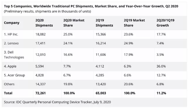 首先是消费市场的买单,今年“黑天鹅”加速了全球PC市场的进一步复苏。2020年第二季度,全球PC市场出货量达到7226.1万台,同比增长11.2%,创下近年来最大涨幅。这是因为疫情期间线上教育和在家办公人群对于PC设备需求增长所起到的强劲带动作用。