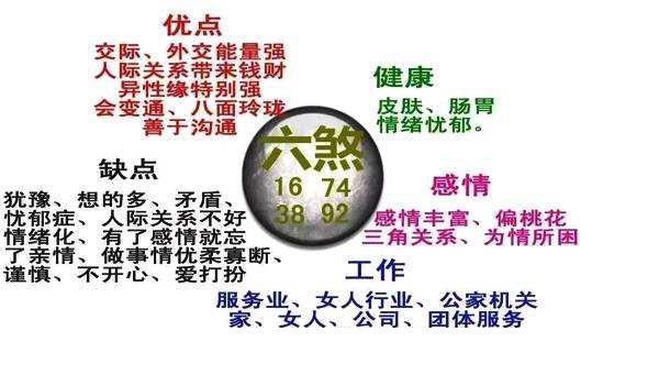 特点:情商非常高,特别会说话的一颗星,完美主义者,会打扮修饰自己,非常挑剔,有强迫症,洁癖,超级顾家,会哄另一半,心思细腻。特别有异性缘,六亲緣薄,做事儿过于纠结,容易情绪低落,报喜不报忧,莫名其妙的不开心,多愁善感,怕打击,六煞多容易抑郁,要么顾家要么不回家,喜欢夜店娱乐场所,特别能吸引政府机关.公检法的人脉,服务意识强,是个公关高手,如果是谈项目也会容易促单成功。