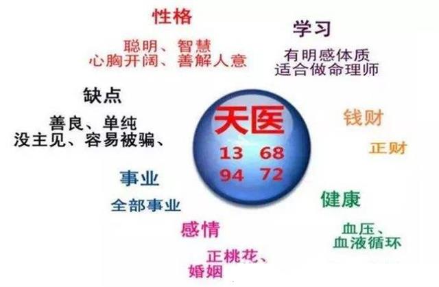 感情:正桃花,未婚遇到天医容易遇到真爱,流年遇到天医也会容易结婚,家庭有幸福感,同一级别天医并列两端会出现两段婚烟;