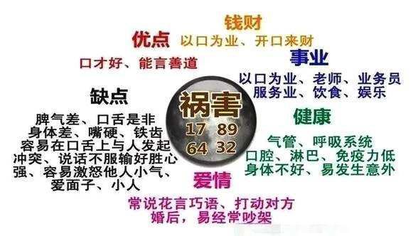 口才特别好,铁齿铜牙,销售能力强,出口成章,点石成金,口吐莲花,典型的吃货,牙齿不好,缝隙大不整齐,说不好的话容易灵验,练习多说好话,不要诅咒别人容易造口业,吃软不吃硬,像刺猬外强内软,能吃苦付出多收获少,付出卖白粉的努力收获卖白菜的钱,不服输,爱争辩,刀子嘴豆腐心,小人是非多,往往贵人会变小人,费力不讨好,死要面子活受罪,祸害+绝命,注意官司纠纷。