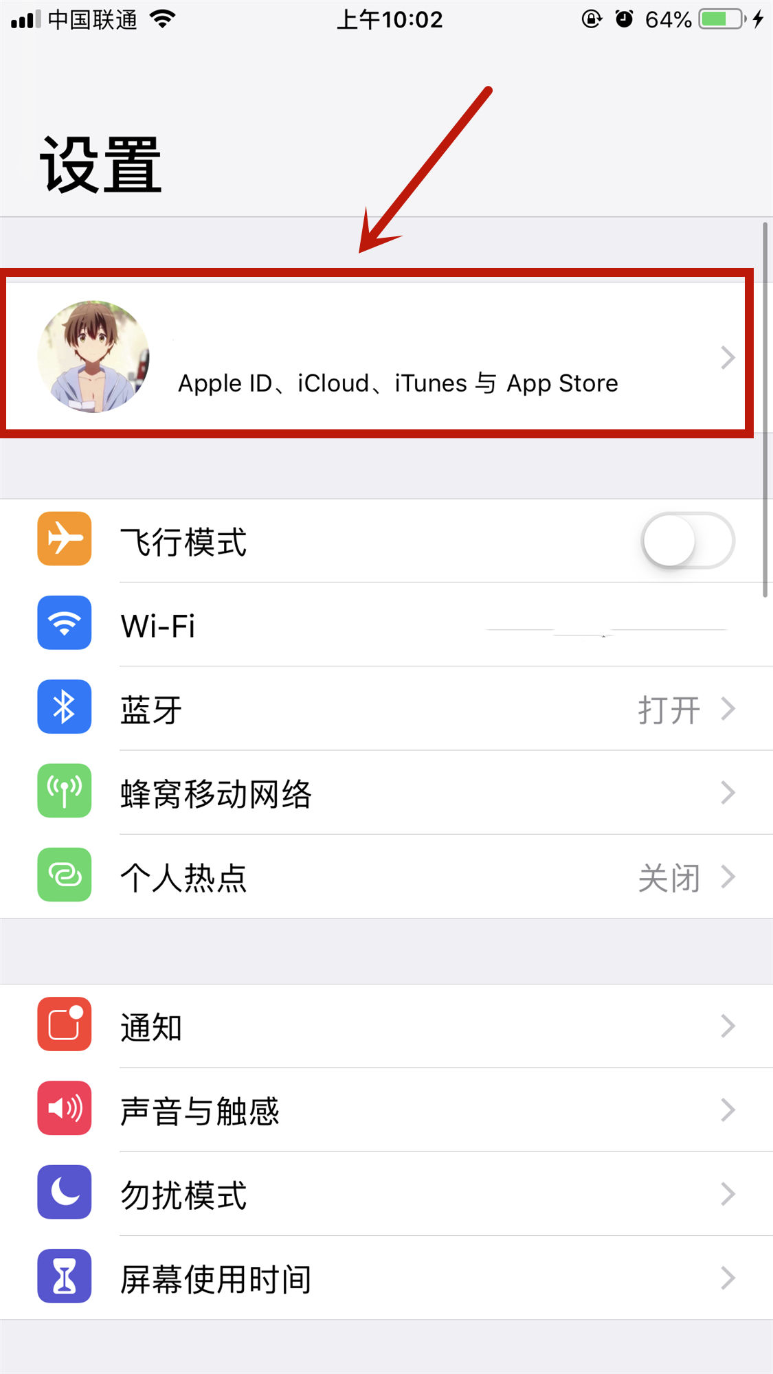 2、进入手机的【设置】选项列表后,点击顶部的【Apple ID...】进入下一步。