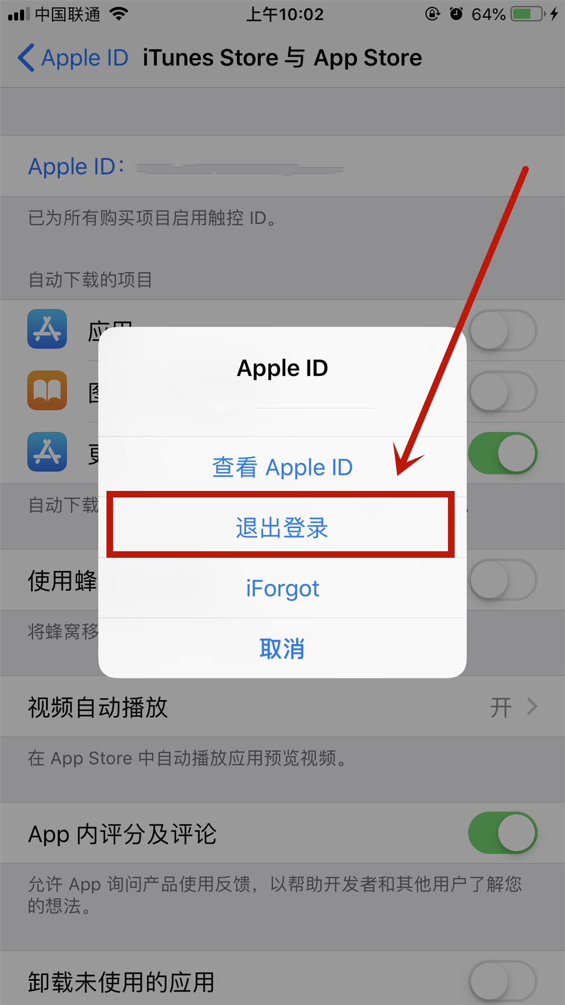 4、进入【iTunes Store...】页面点击Apple ID后跳出弹窗点击【退出登录】。