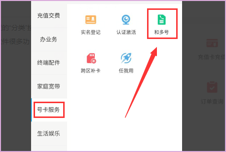 4、接着在分类选项下,找到“号卡服务”,在相应界面选择“和多号”功能,即可通过多号业务,开通小号。