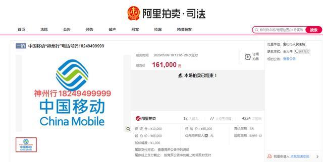 10月19日消息,据阿里拍卖官方微信公众号显示,在5月,由黑龙江省密山市人民法院公开拍卖尾号“99999”的中国移动号码,据悉该标的物的资费套餐为神州行者自选套餐9元-60元,起拍价为6.5万元。
