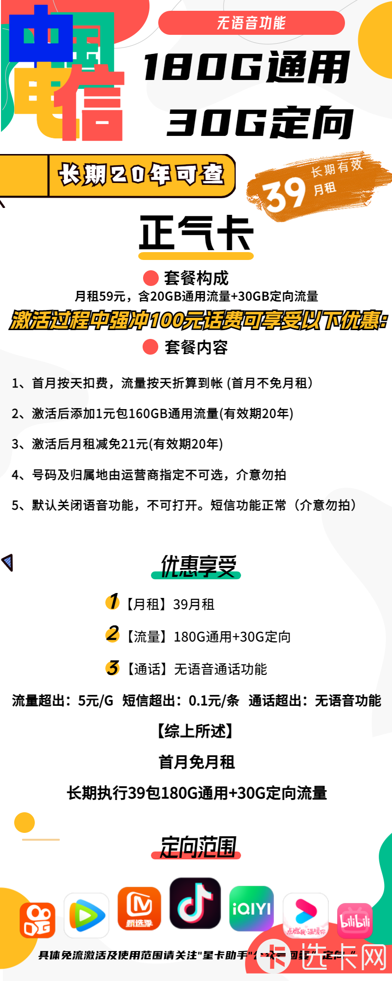 电信正气卡39元月包180G通用流量+30G定向流量+无语音功能2023-05-15关键词: 电信正气卡 阅读(287)