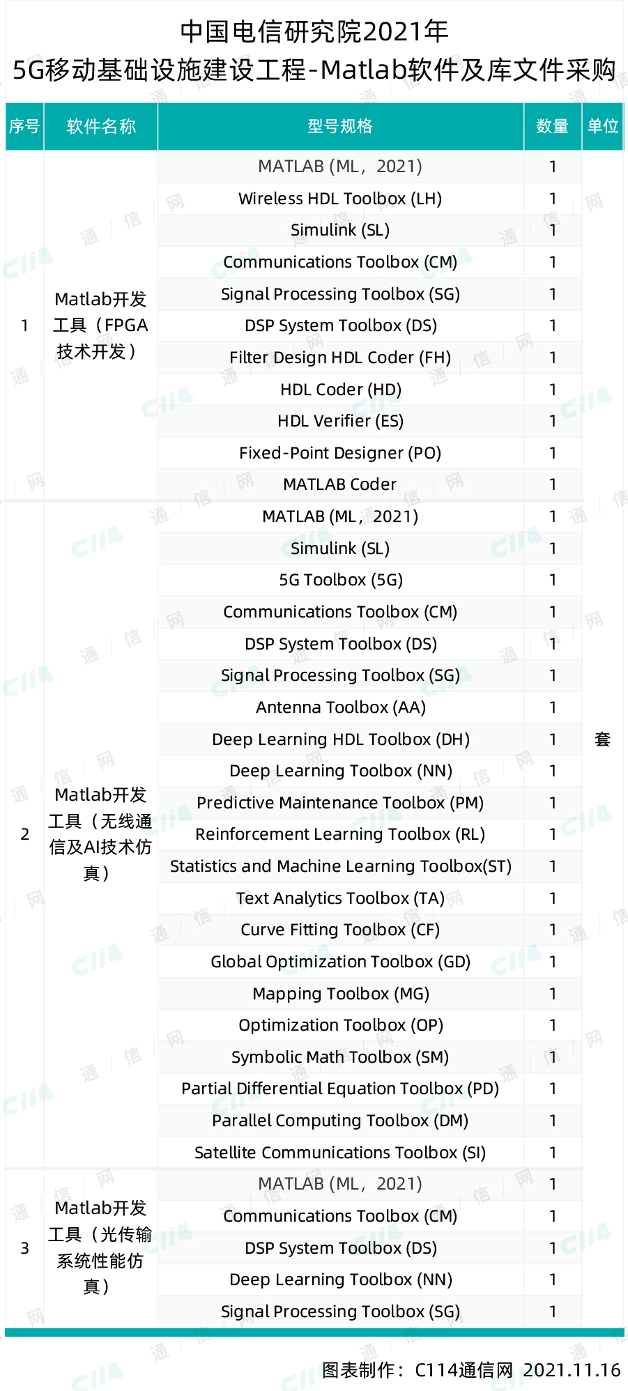 11月16日消息从中国电信官网获悉,中国电信研究院今日启动2021年5G移动基础设施建设工程-Matlab软件及库文件单一来源采购,迈斯沃克中标。