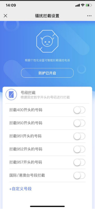 进入之后我们看到拦截设置页面,可以按照号段进行拦截,如图所示: