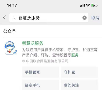 如果你是联通用户,我们也可以使用联通官方的拦截服务,关注智慧沃服务公众号,如图: