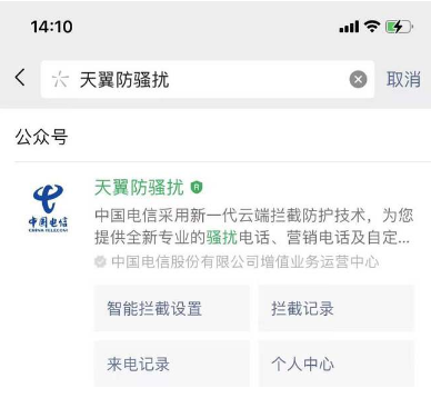 与中国移动和联通类似,电信也有一个叫做天翼防骚扰的公众号,我们点击关注: