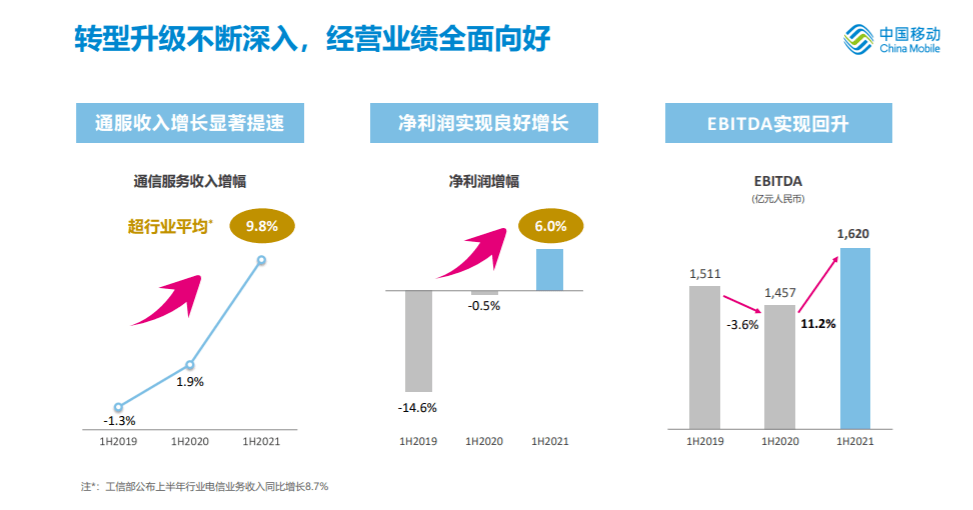 中国移动董事长杨杰表示:“2021年上半年,面对错综复杂的内外部环境挑战,中国移动牢牢把握经济社会数字化转型加速的发展机遇,按照创世界一流“力量大厦”发展战略总体部署,聚焦“四个三”战略内核,全面推进数智化转型,深入实施“5G+”计划,推动CHBN全向发力、融合发展,积极开拓数字经济新蓝海,转型升级不断深入,经营业绩全面向好,行业领先地位稳固,实现了高质量发展。”